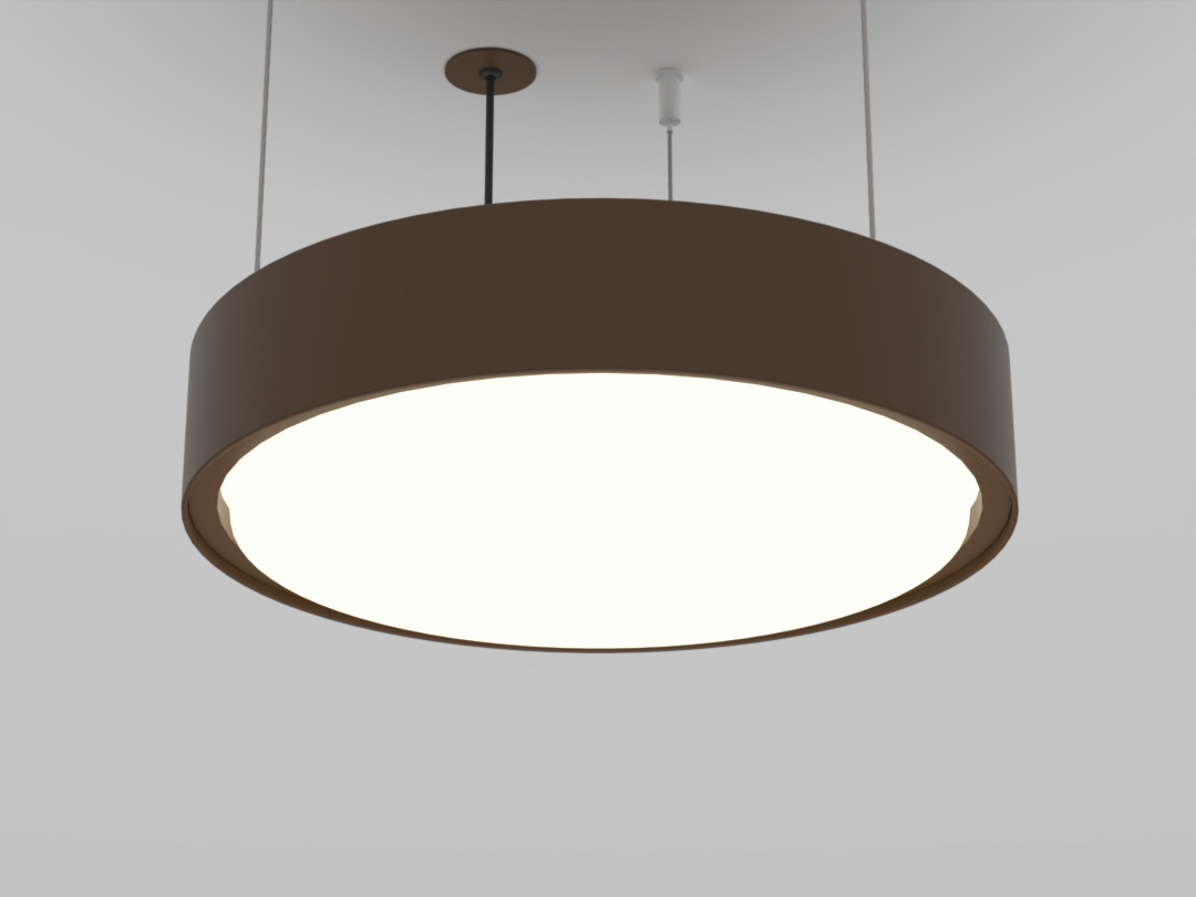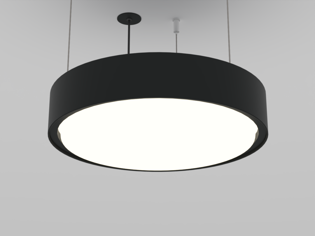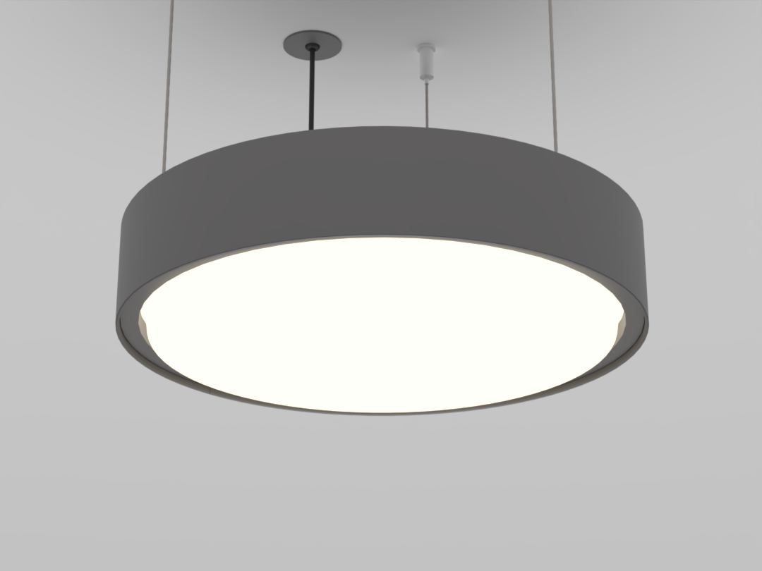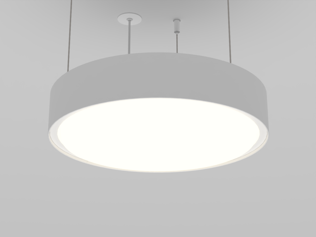 A luminária Pallo proporciona uma iluminação homogênea e suave, com baixo ofuscamento. Instalação pendente no teto com fixação através de cabos aço.