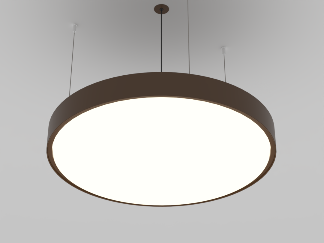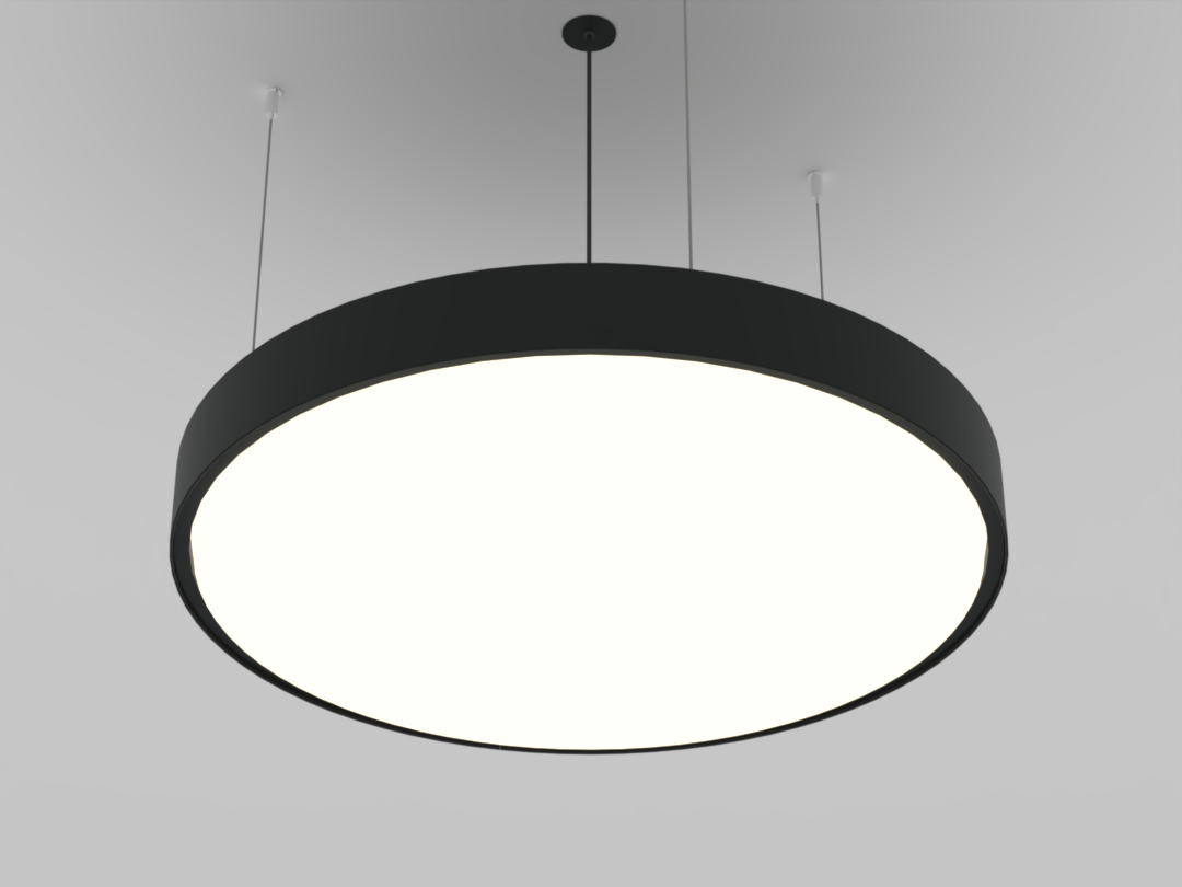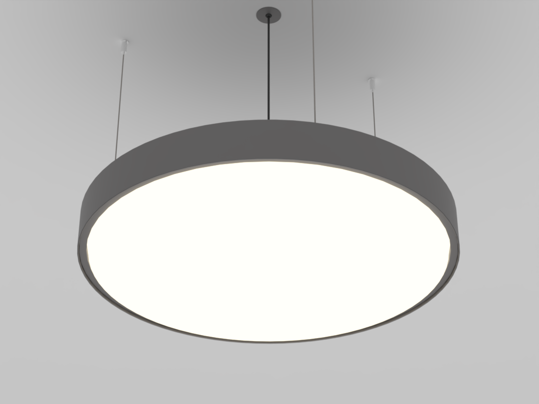 A luminária Pallo proporciona uma iluminação homogênea e suave, com baixo ofuscamento. Instalação pendente no teto com fixação através de cabos aço.